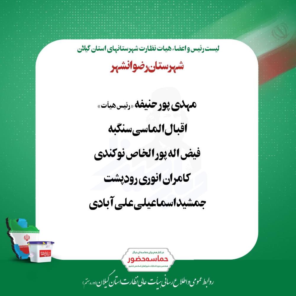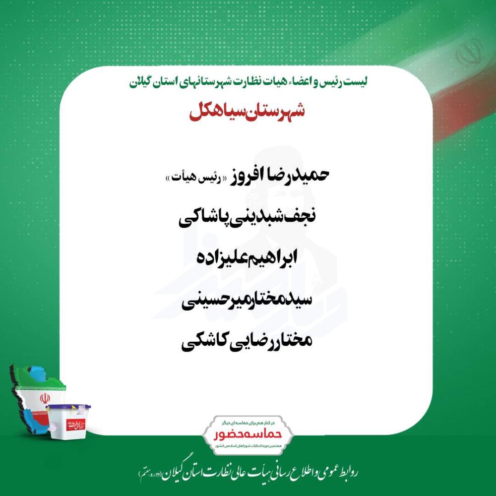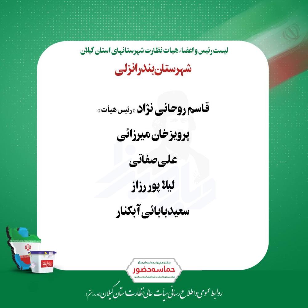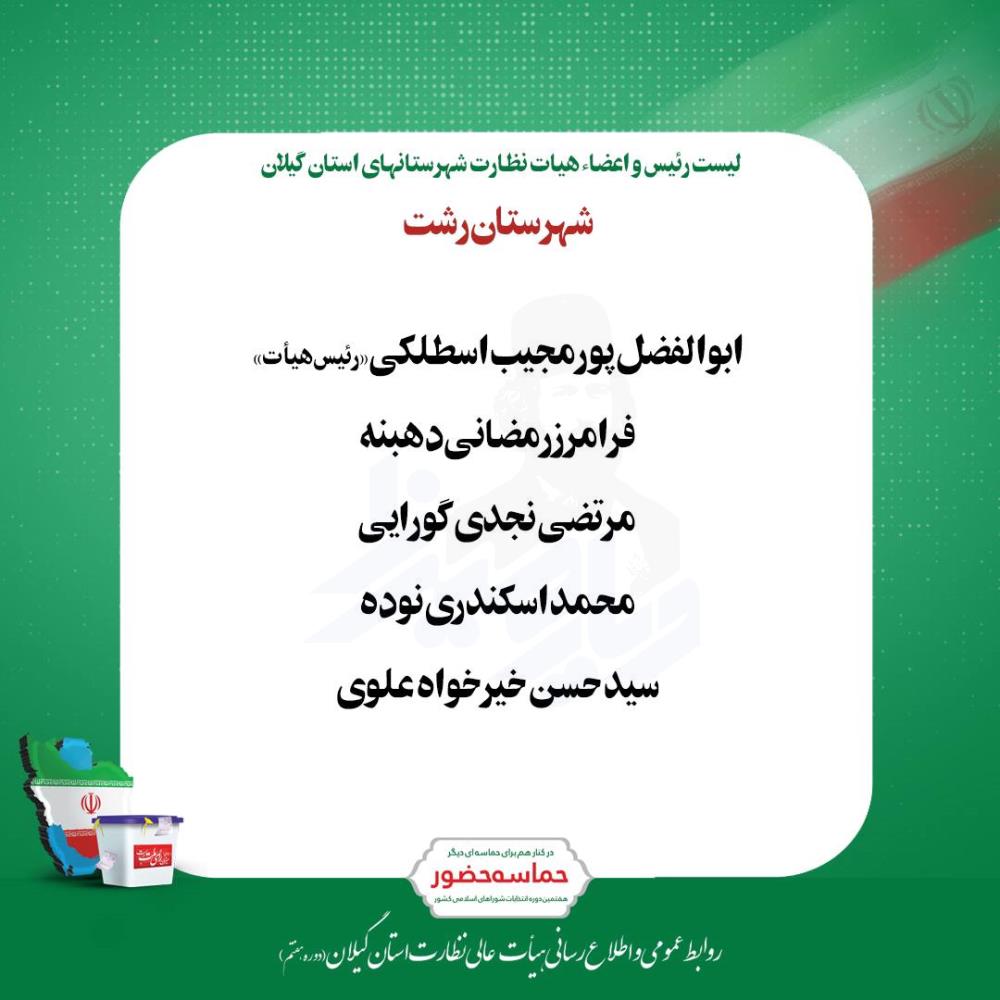 بر اساس حکم هیأت مرکزی انتخابات شوراهای اسلامی کشور، اعضای هیأت نظارت شهرستان‌های استان گیلان برای انتخابات شورای هفتم مشخص شدند.