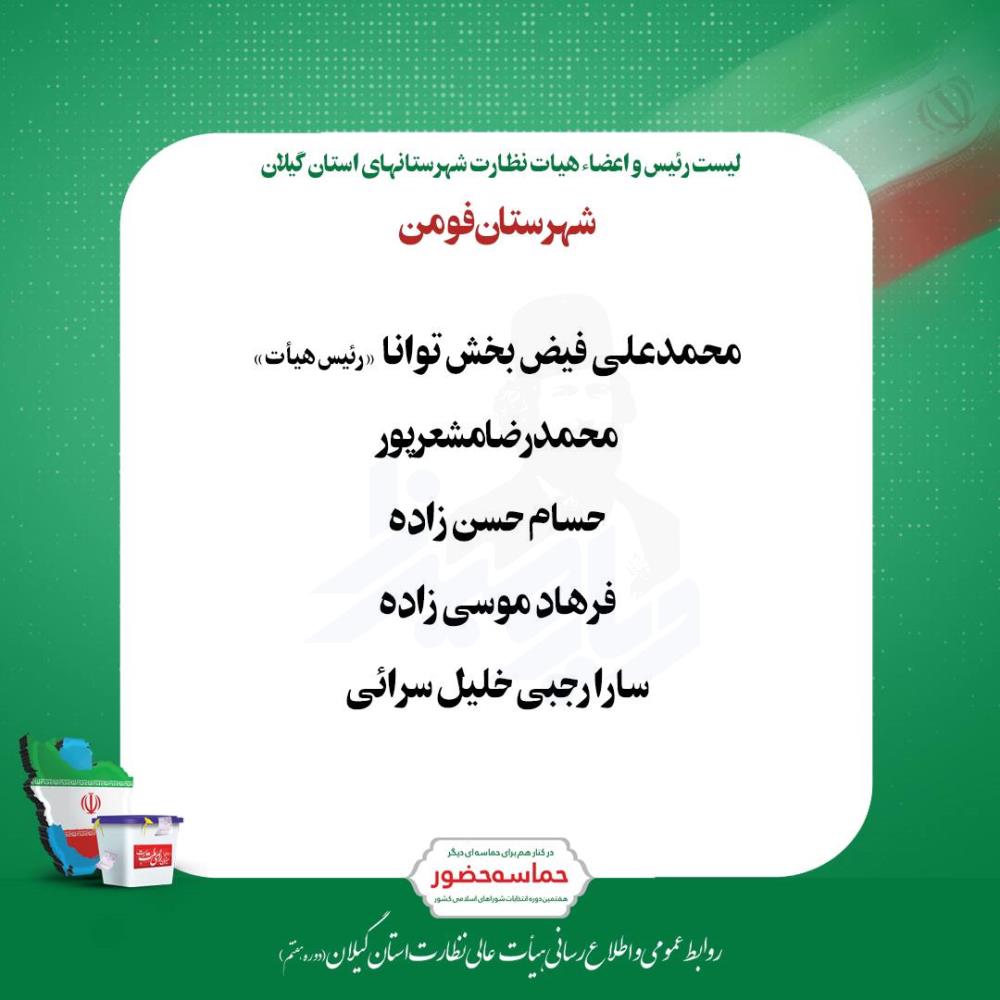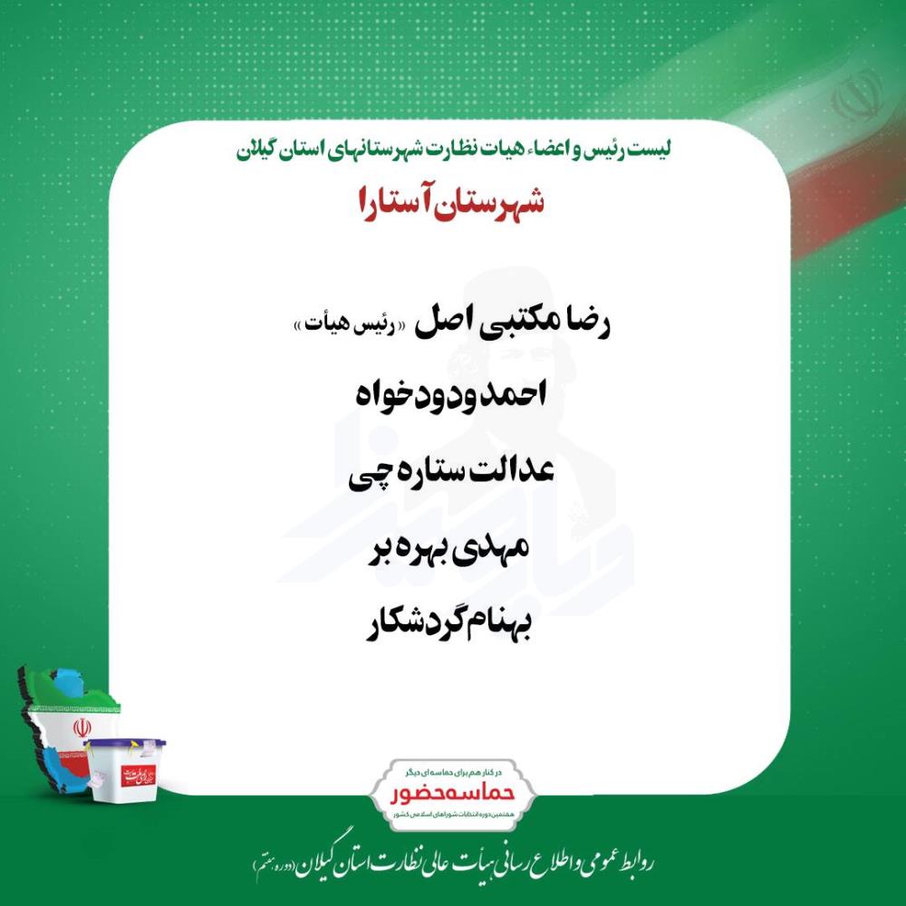 جارستان: بر اساس حکم هیأت مرکزی انتخابات شوراهای اسلامی کشور، اعضای هیأت نظارت شهرستان‌های استان گیلان مشخص شدند.